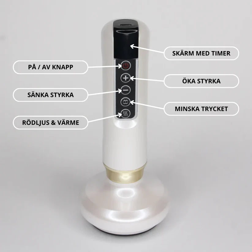 Vår Massager använder vakuumterapi och rödljusterapi för att stimuilera blodcirkulation och lymfdränage, en kombination som främjar hudens fasthet och spänst.