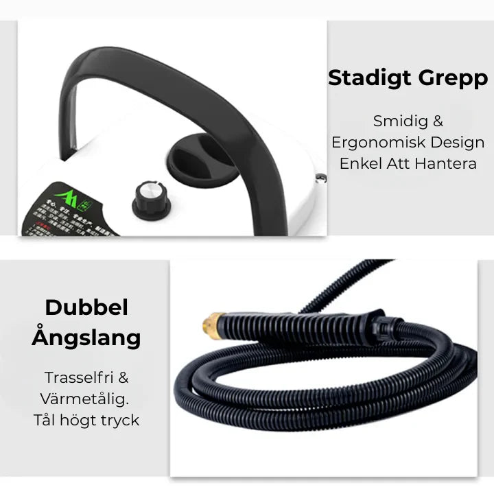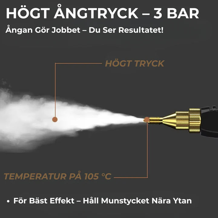 Het ånga trycks ut med 3 BAR – det får fett, bakterier och ingrodd smuts att smälta bort. På kakel, tyg, plast och metall. Du ser skillnaden direkt.
